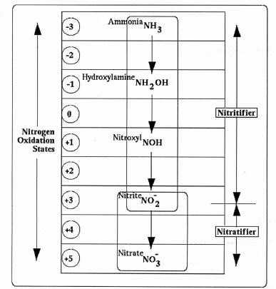 Assuming that ammonia is, in fact, the starting point, Figure 1 provides a complete overview of the currently accepted nitrogen transitions through a normal nitrification sequence, covering both ammonia and nitrite oxidizers. These biochemical reactions are all respirative, with oxygen used by the organisms as a sink for electrons drawn from their reduced nitrogen substrates.